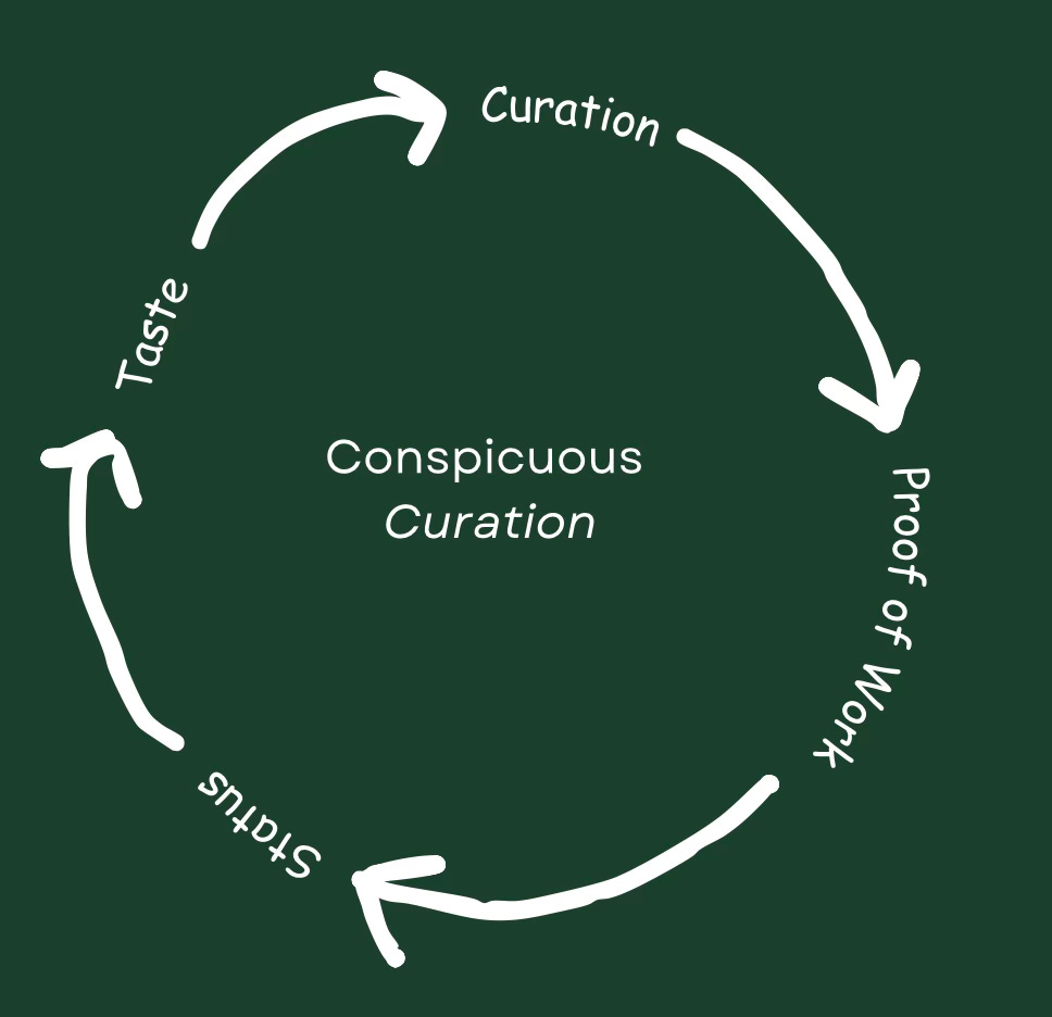 In Wei’s social media era, Proof of Work required creation, and thus consumption, and ultimately - wealth. In the Curation era, neither consumption nor wealth are prerequisites for Status – simply Taste. Taste is the new tool by which individuals can acquire Status.