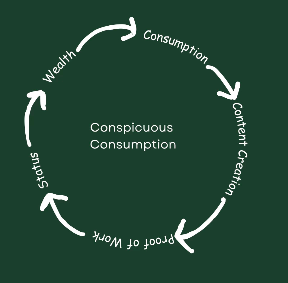 Thus, status, consumption and, as a result, wealth, are inextricably linked- but this is nothing new. In fact, in 1899 Veblen coined the term “Conspicuous Consumption” to describe the act of consumption as a means of projecting identity and gaining status. This has evolved into what Toby Shorin today calls the “Starter Pack Era”, in which “classes of people are identified through oblique subcultural references and the products they are likely to consume.” In this era, goods are, in a sense, reduced to “investment assets where one can extract social capital” (h/t Dena Yago).